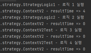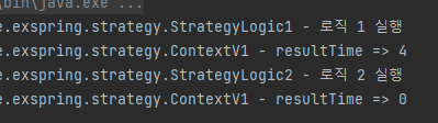 실제로 실행한 결과값이 각각 StrategyLogic1,2에서 따로 구현한 로직이 실행되는것을 볼 수 있다.