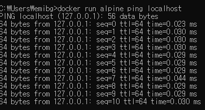 - exec {이미지 이름 or 컨테이너 ID} {명령어}: 이미 실행중인 컨테이너에 명령어를 전달함 (run은 새로 만들어서 실행), 대부분 -it 명령어와 함께 사용 ( -it: 지속 해서 명령어를 이어 나가는 커맨드 옵션 )