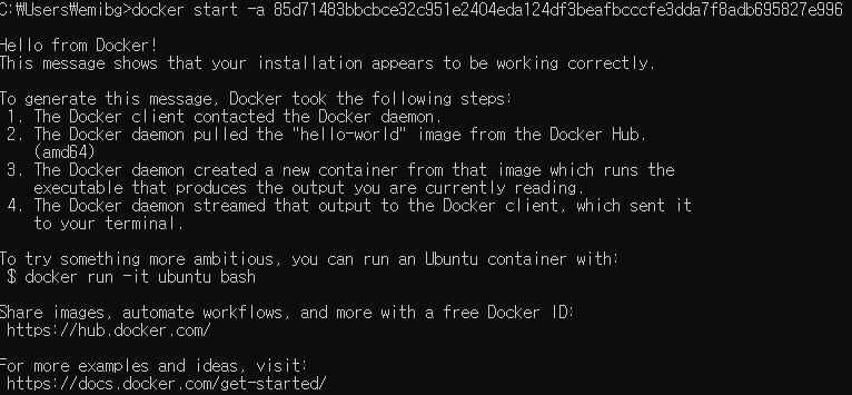 즉 해당 명령어를 한번 더 실행하게 되면 hello-world가 위 문구 없이 실행된다 ( 로컬 이미지 저장소에 저장 되었기 때문 )