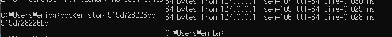 docker ps 를 통해 실행중인 컨테이너의 id 값을 알아 내고 stop 명령어로 정지 시킴으로 써 계속 진행중이던