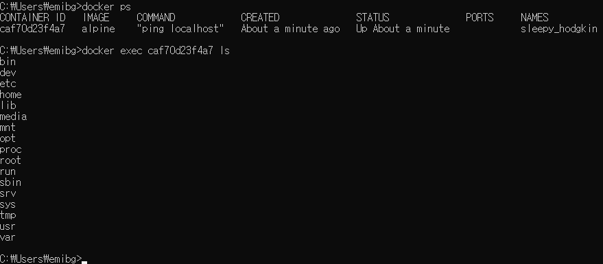 - exec {이미지 이름 or 컨테이너 ID} {명령어}: 이미 실행중인 컨테이너에 명령어를 전달함 (run은 새로 만들어서 실행), 대부분 -it 명령어와 함께 사용 ( -it: 지속 해서 명령어를 이어 나가는 커맨드 옵션 )